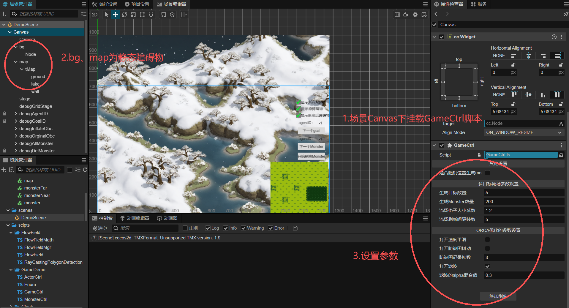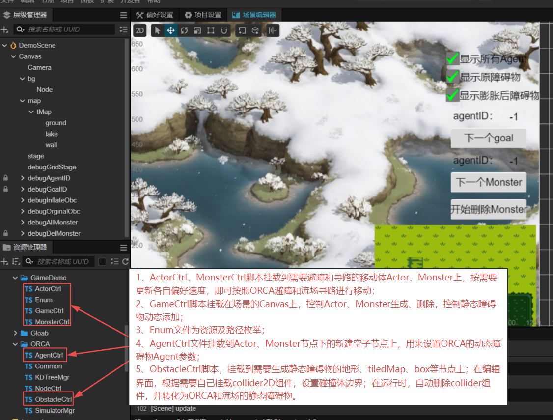 1. 需要挂载的一般只有ActorCtrl、MonsterCtrl、GameCtrl、AgentCtrl、ObstacleCtrl五个脚本,需要在编辑界面设置参数;