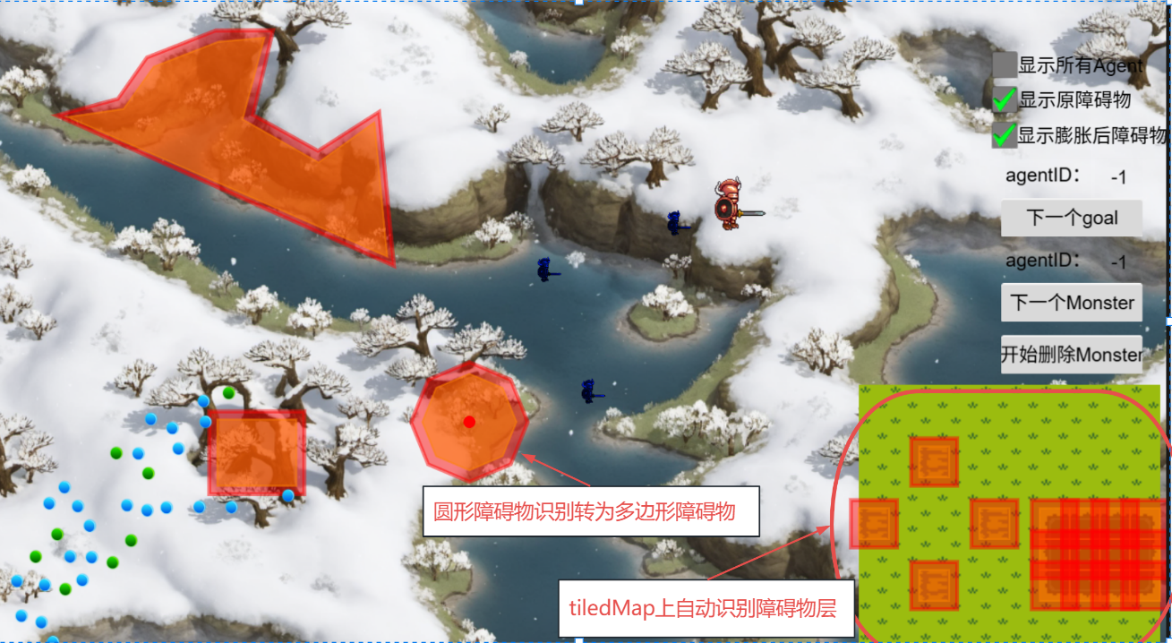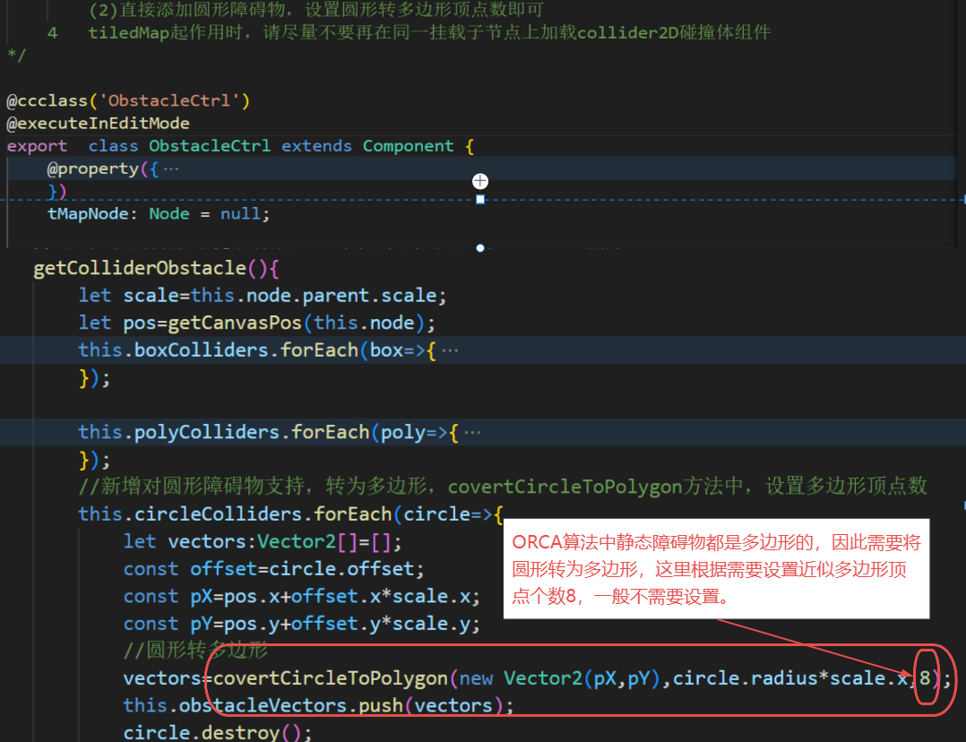 2. 增加了对圆型障碍物支持,该脚本中getColliderObstacle里,引用了convertCircleToPolygon方法,将圆形转为多边形处理,根据需要变更多边形顶点个数,如将8改为XX。