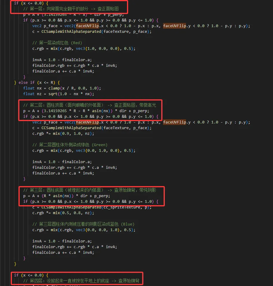 建立完成以后,我们可以算出来当前渲染像素点相对于“卷曲交界线”的垂直距离x(投影),然后我们就能够根据x的值来进行分区,得出最终颜色。