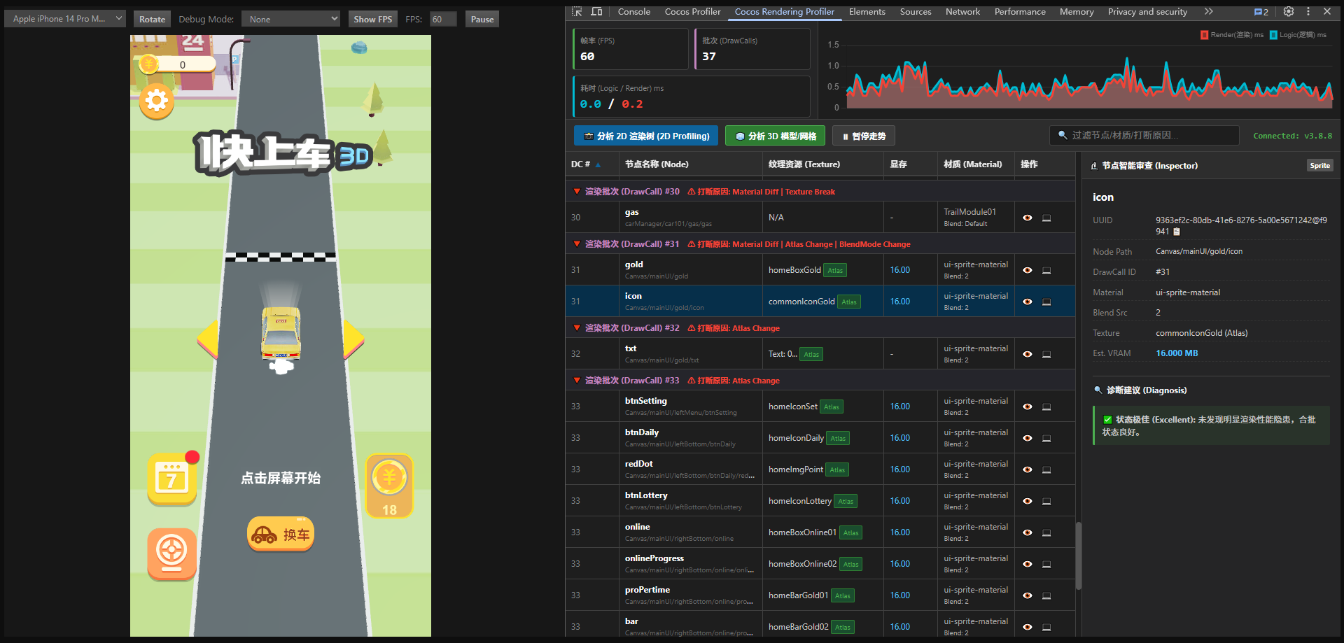 Material Diff、Texture Break还是BlendMode Change导致的 DC 增加。 - 离屏剔除检测 (Off-Screen) :自动高亮那些在视口外却依然在消耗 DrawCall 的“流氓”节点。