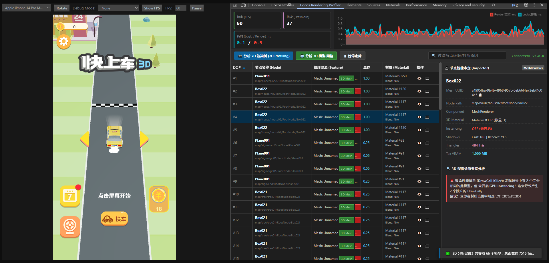 模型合批分析 :一键导出场景所有 Mesh 信息,自动识别哪些模型没开启
