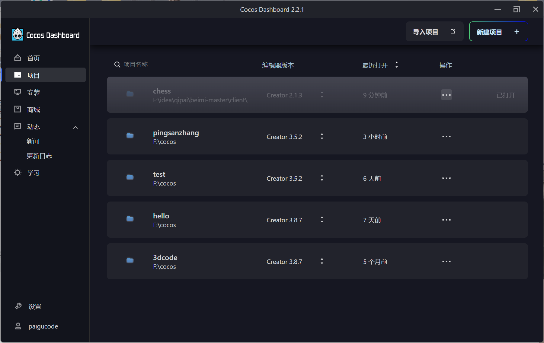 软件:Cocos DashBoard2.2.1 打开项目Creator版本:2.1.3 电脑win11