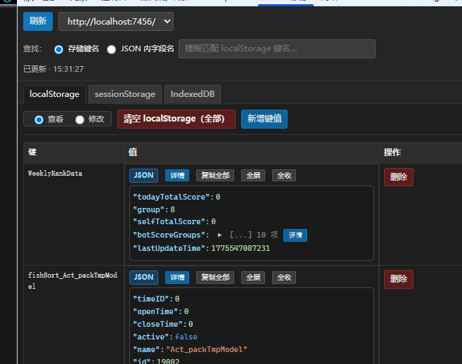 cc.sys.localStorage 这个可以看到你所有本地的存储,键值对的
