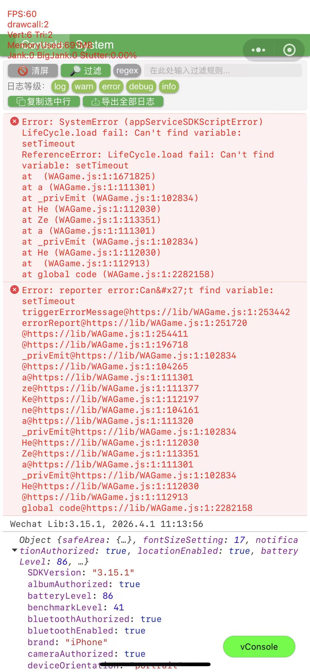 微信小游戏 预览报错Error: SystemError (appServiceSDKScriptError)LifeCycle.load fail: Can't find variable: setTimeout