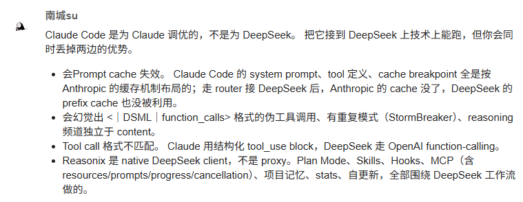 reasoning_content默认下一轮不能塞回去(官方文档明说了),大多数框架就扔掉了。Reasonix 跑一个便宜的 V3 二次调用把推理提取成结构化 plan,一个计划里有几个"不确定的点"直接可查,必要时还能 self-consistency 跑多分支。 -
