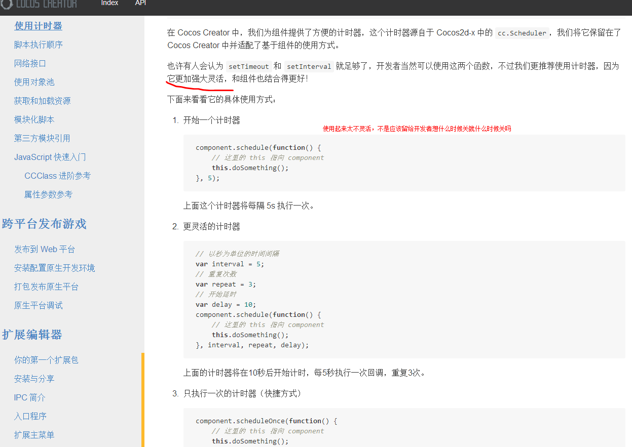 但是官方提供的文档里面说计时器更加强大灵活,我发现如果我想每个n秒执行一次cc.log(num);的输出,在我需要的时候(重复次数不确定的情况下)关闭实现起来就要麻烦好多(n秒 != 每帧)