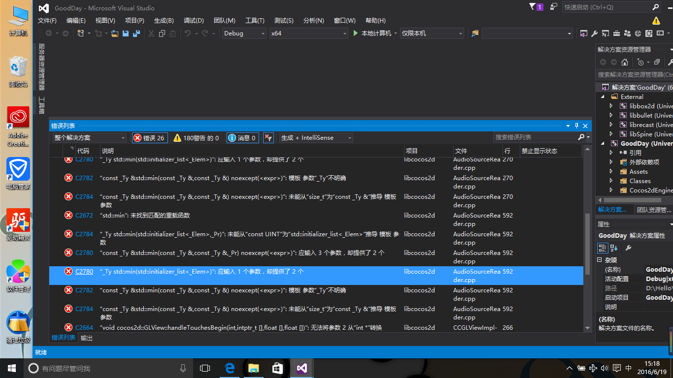 本人菜鸟一枚,想用visual studio2015和cocos2d-x 3.11.1搭建项目,刚新建好个项目就报错 如图