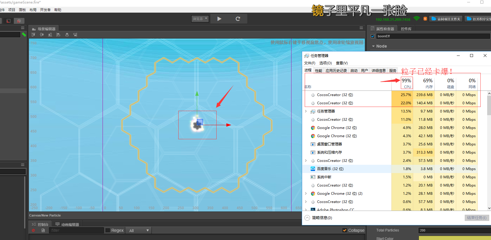 选中粒子后,就会进入预览模式,如果不预览,可以关闭粒子组件上的 Preview 选项,或者别选中粒子,这样就不卡了。