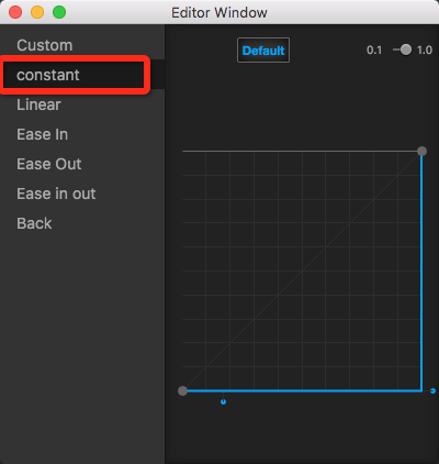 在时间曲线编辑窗口中,选择 constant 类型即可取消补间动画。如图: