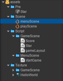 在cocos creator中制作游戏本质上就是通过各种的资源的组合拼接来构成一个完整的游戏。图中展示主要有四类资源,预制类资源,场景节点资源,脚本资源以及图片纹理资源。