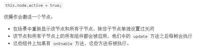 如果这个节点上有个组件已经手动设置过enabled为false了,这时候将节点的active设为true,依这个文档来看,仍会将这个组件的enabled设为true,这种结果可能不是开发者想要的吧