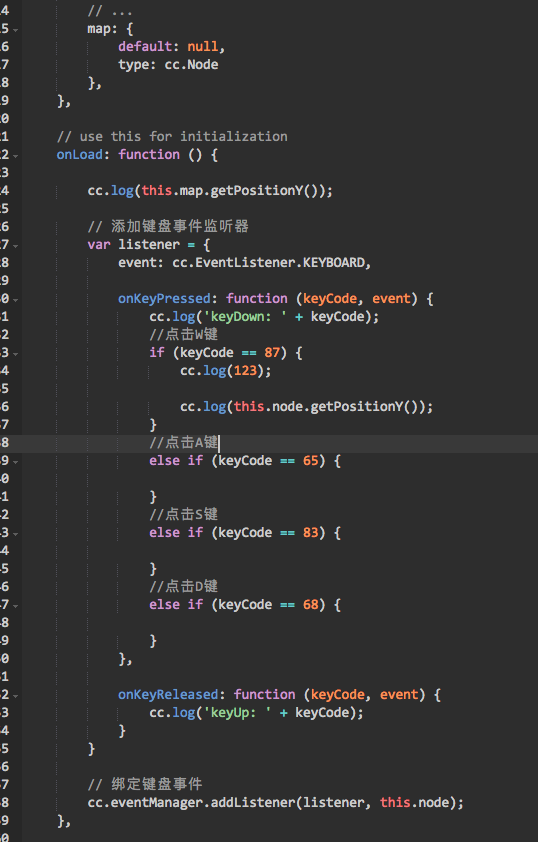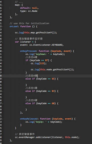 目前我在properties里面定义了一个map的变量,类型是cc.node,然后我在onload函数里面添加了一个键盘事件监听器,想在里面的onKeyPressed函数中打印map的positionY,但是用了this.map.getPositionY()却提示this.map不存在,请问该怎么做?