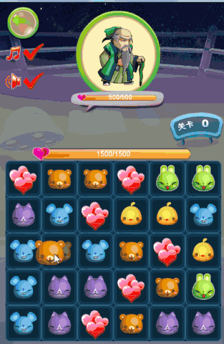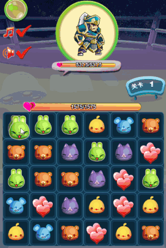 1.用手点起一个小球,然后开始和相邻的彼此交换位置,转出可以消除的界面(比如横着三个,竖着三个的,也包含T形,土行 田行等,每种糖果打出伤害不同,三个心的形状的是给自己补充血的)