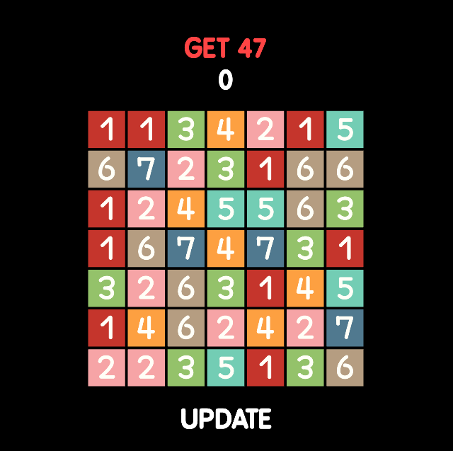 当没有可移动的方块时,可以点击下面的update按钮横向相连的方块数字之和会增加分数,纵向相连的方块数字之和会减少分数