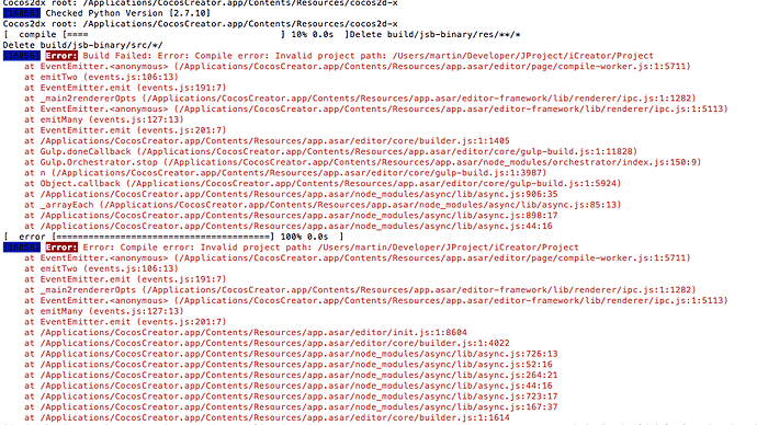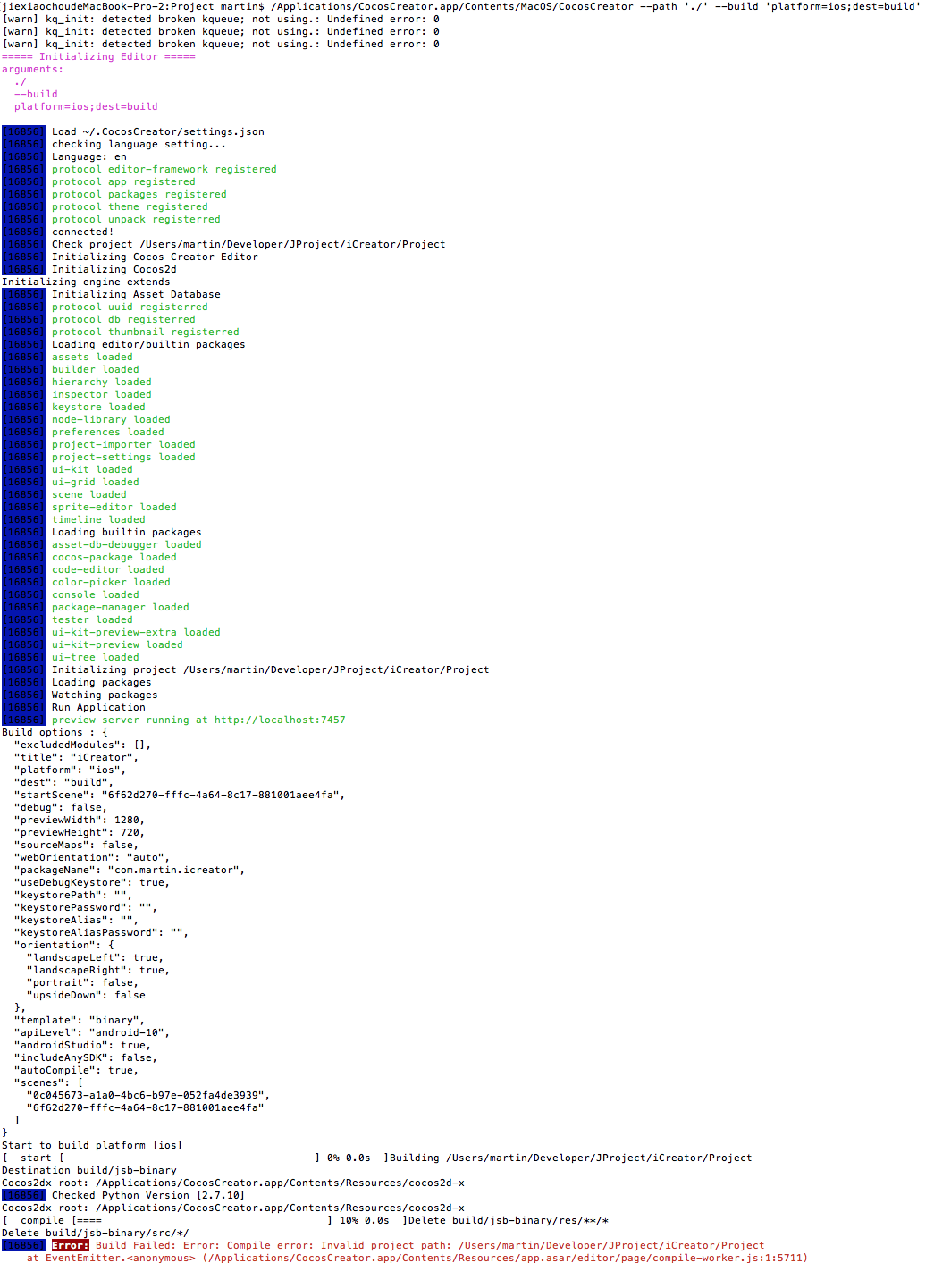 /Applications/CocosCreator.app/Contents/MacOS/CocosCreator --path ‘/Users/martin/Developer/JProject/iCreator/Project/’ --build ‘platform=ios;dest=/Users/martin/Developer/JProject/iCreator/Project/build/’