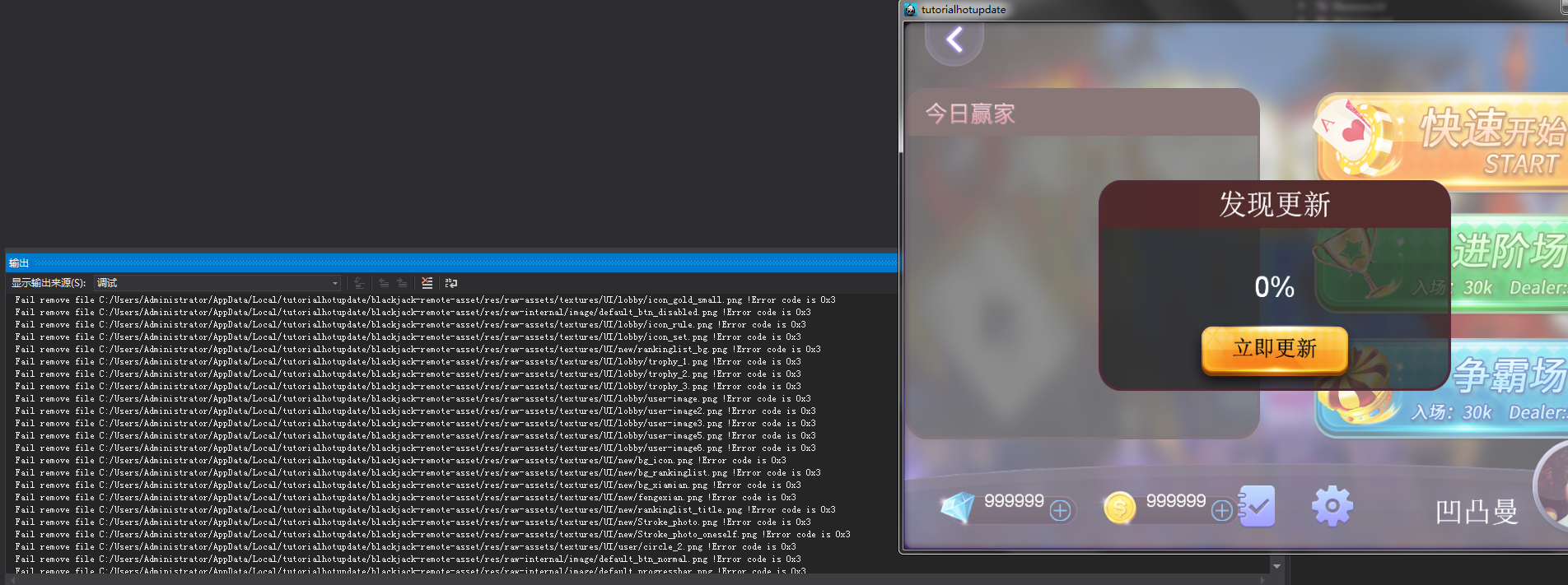 热更新走通了,文件下载到了 C:\Users\Administrator\AppData\Local\tutorialhotupdate\blackjack-remote-asset, 可是进步了table 场景 。