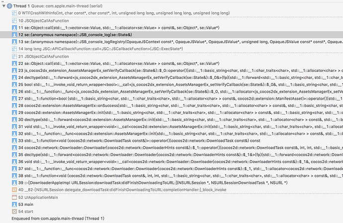 23 jueyule-mobile 0x00000001051938c8 js_cocos2dx_extension_AssetsManagerEx_setVerifyCallback(se::State&)::$0::operator()(std::__1::basicstring1::char_traits, std::1::allocator > const&, cocos2d::extension::ManifestAsset) const + 7551176 (jsb_cocos2dx_extension_auto.cpp:770)