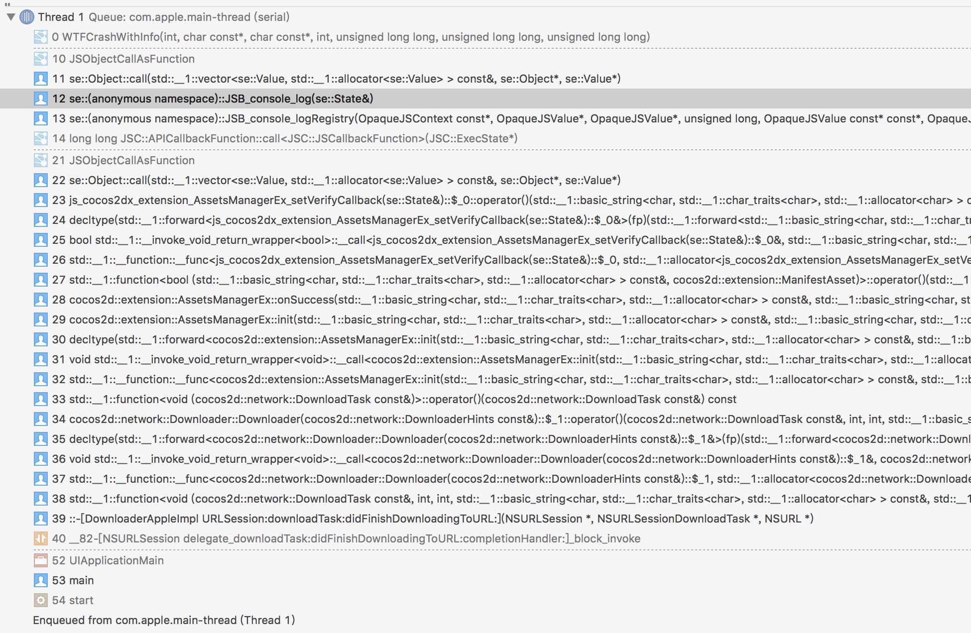 24 jueyule-mobile 0x0000000105193668 bool std::1::invoke_void_return_wrapper::call1::basic_string1::char_traits, std::1::allocator > const&, cocos2d::extension::ManifestAsset>(js_cocos2dx_extension_AssetsManagerEx_setVerifyCallback(se::State&)::0&&&, std::__1::basicstring1::char_traits, std::1::allocator > const&&&, cocos2d::extension::ManifestAsset&&) + 7550568 (_functionalbase:318)