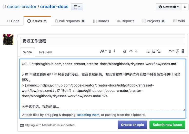 在 issue 信息中已经自动包括了刚才页面的链接和高亮的文本,接下来只要在后面补充你的问题然后点击绿色的 Submit new issue 按钮即可成功提交反馈了!