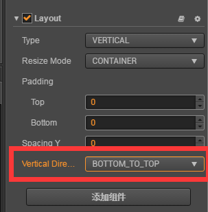 content节点加layout组件,layout设置为垂直布局,然后其后面会多出来属性,设置排列顺序