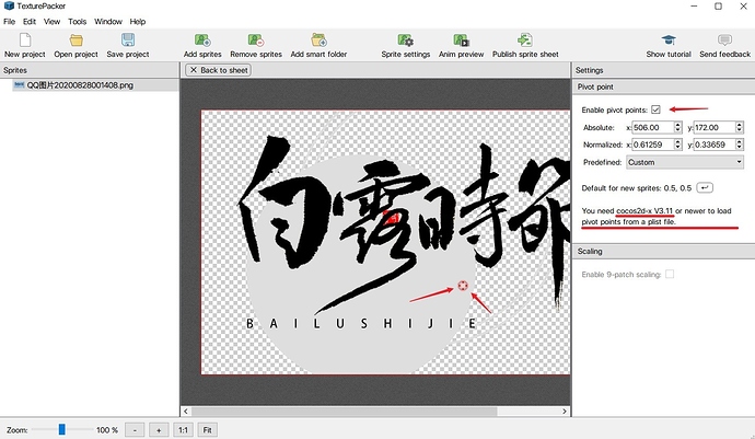 TexturePacker有个Enable pivot point的功能,似乎是为每个图片定锚点的,但是提示只支持cocos2dx3.11以上的版本。不知道再cocoscreator里怎么使用呢?@jare @Knox
