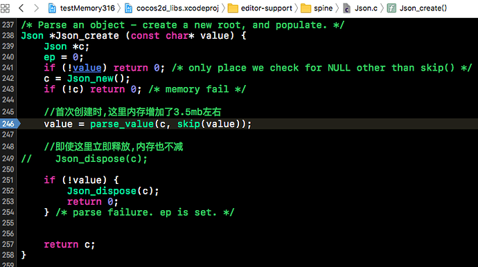 跟踪了spine创建时的代码,发现在app第一次创建spine执行到以下代码时,内存加了3.5~4mb,可以确定多出来的内存就是这里产生的