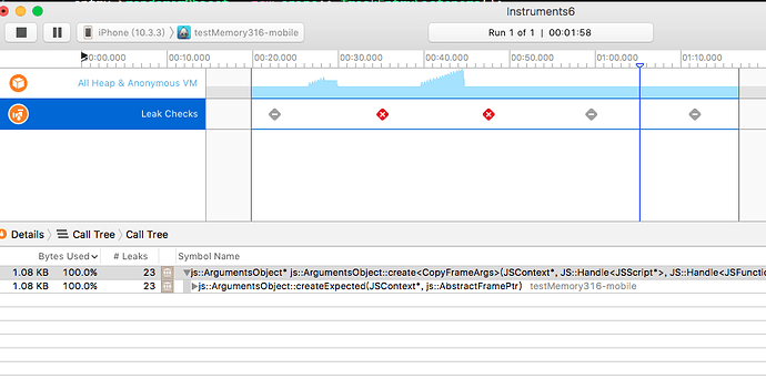 使用xcode自带的leaks检测内存泄露,使用同样的操作,结果如下图