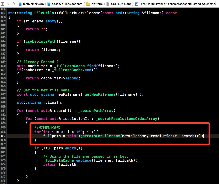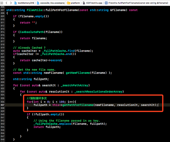 我修改了FileUtils里的一行代码,将 getPathForFilename 强制调用了100次循环,按理来说不会有内存问题啊,结果。。。