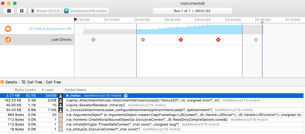 将SkeletonRenderer.cpp 中的析构方法里全注释,spine不做任何析构,故意造成内存泄露。测试结果如下: