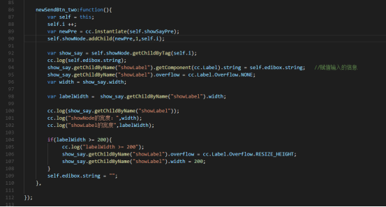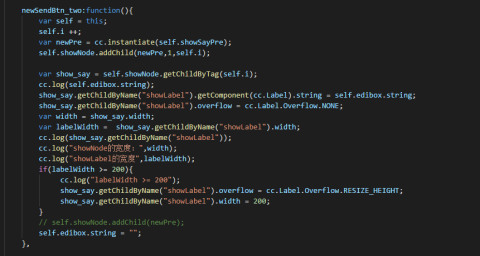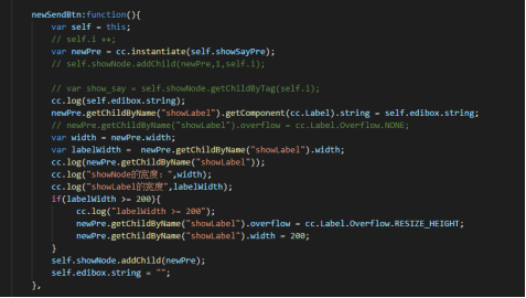 第一种方法如上图:先生成预制体,先绑定到节点下,再根据tag获取当前的预制体,给预制体中的label赋当前输入的文字及玩家名称等信息。在此方法中,获取到的labelwidth值是赋值之后label的宽度,但是达到固定的宽度之后还是不能换行。
