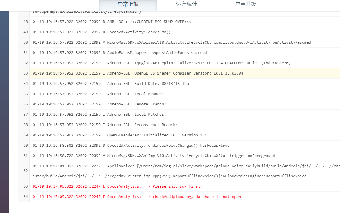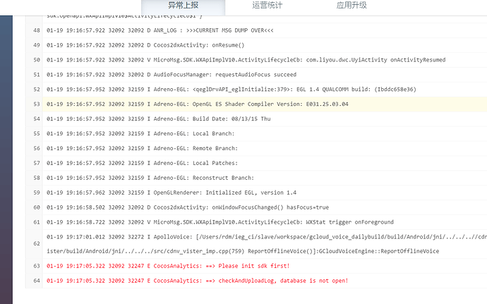 01-20 16:17:23.197: E/CocosAnalytics(17447): ==> checkAndUploadLog, database is not open!