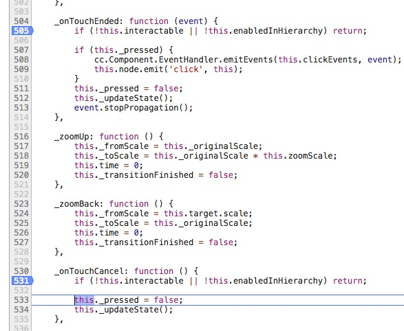 鼠标在边缘点击按钮不放,按钮缩小完毕后,鼠标的点由于按钮的缩小,跑到了按钮外面,如果这时候松开鼠标,相当于你将鼠标移动到按钮外面,回调的是touchCannel,而不是touchEnded,所以不会有回调产生,只有你的鼠标在按钮内部松开,才会调用touchEnded, clickEvent才会回调