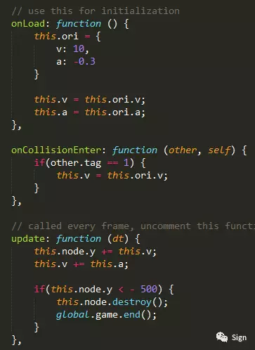 onCollisionEnter里写上碰撞后发生的情况:碰到方块就弹起。