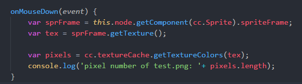 新人请教一下,在creator的脚本代码中,如何获取一个图片的全部像素数据?我翻了一下API文档,只在textureCache这边找到了一个可能是这个作用的api,叫getTextureColors。我打算在鼠标单击的时候来获取节点上的sprite图片的像素信息,写了如下的代码: