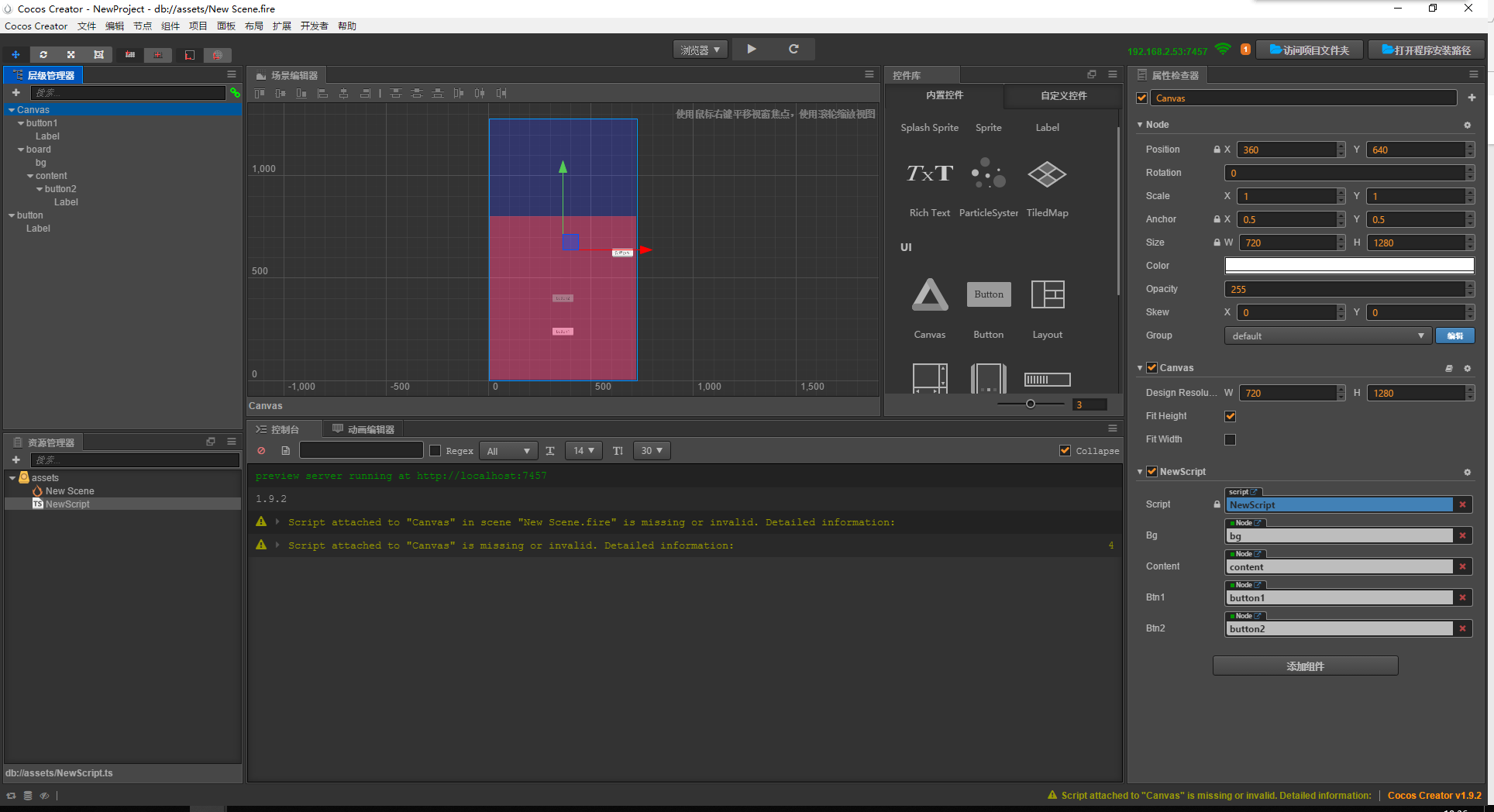 button1为场景根节点上的一个按钮(做对比用),board为一个弹出窗口,大小为7201280,bg为弹出窗口的背景大小为 7201280(蓝色区域)content为弹出窗口的内容区域大小720*800(红色区域)