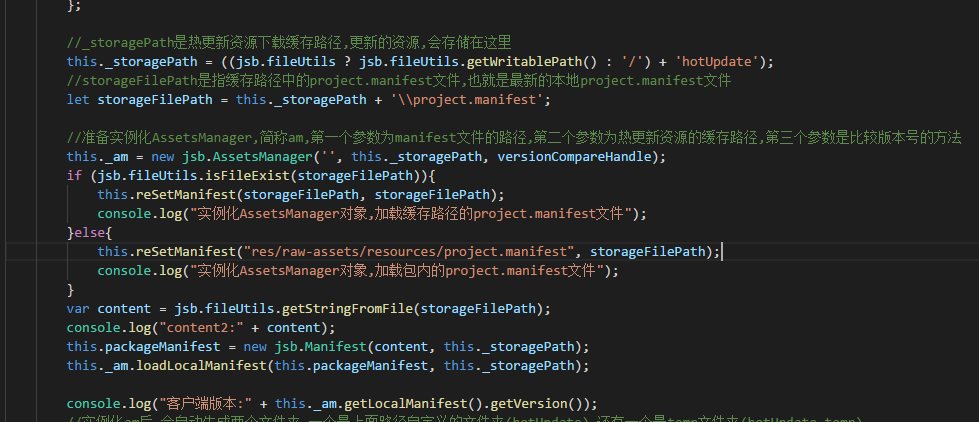 this._am = new jsb.AssetsManager(’’, this._storagePath, versionCompareHandle);