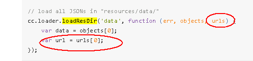 cc.loader.loadResDir(‘data’, function (err, objects, urls) {