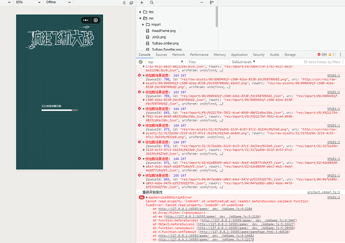 重现方式:新建两个场景,第一个显示的是加载场景,然后在加载场景里预加载主场景,测试前先清理本地缓存文件,让主场景里的资源在预加载的时候从远程服务器下载,在加载场景里预加载主场景的过程中断网,这个断网也得正好拿捏好时候这个进度卡住,且不会触发加载结果回调方法的问题才会出现,这样卡住后再重新调用预加载该场景无效,并且试过cc.game.restart()则直接报错:Cannot read property ‘indexOf’ of undefined;at api readdir beforeSuccess callback function