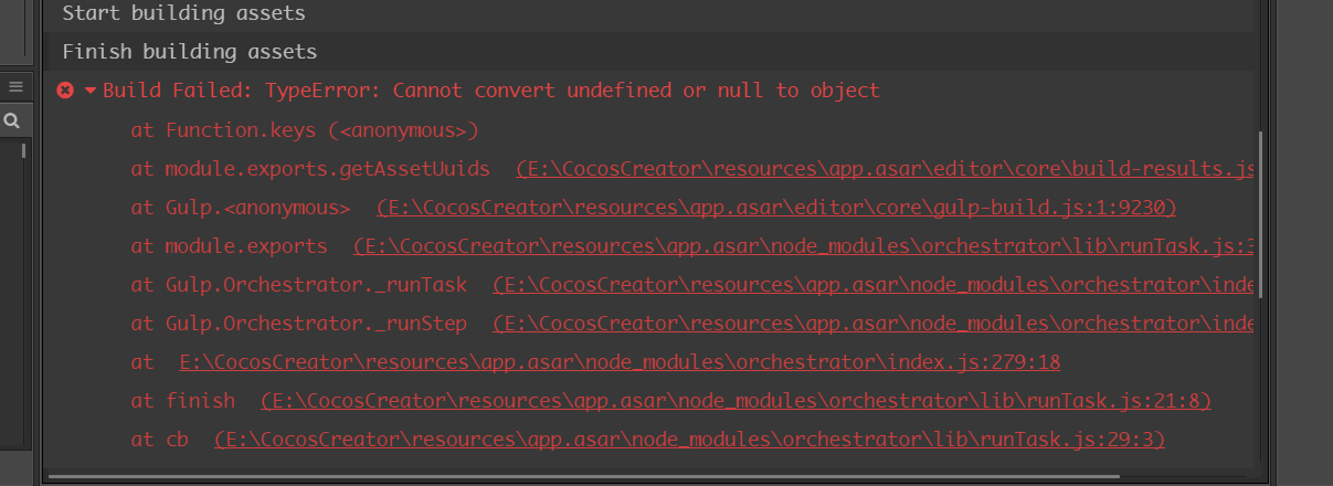 构建报错了,我记得这个错误好像是因为勾选了合并了首场景资源,去掉勾选看看?这个错误应该在 2.0.1 有修复了。