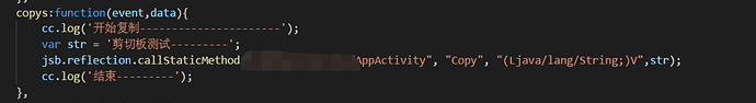 jsb.reflection.callStaticMethod(“org/cocos2dx/javascript/AppActivity”, “Copy”, “(Ljava/lang/String;)V”,str);
