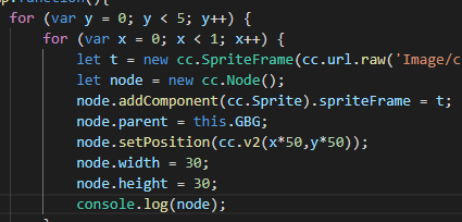 (原本代码有console.log,这里我删掉了。在浏览器的开发人员工具里,点开输出的cc.node,可以看到里面的x,y属性修改成功了,但是canvas上面显示的位置还是父节点的原点。双击x,y,并手动修改一个值,回车后canvas上的精灵位置能够移动,不再是原点)
