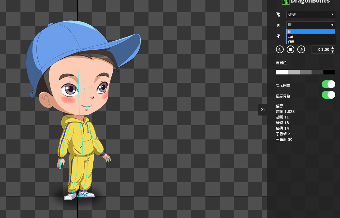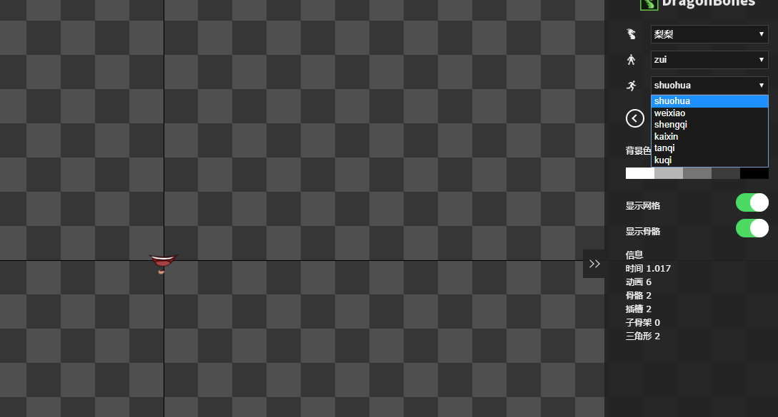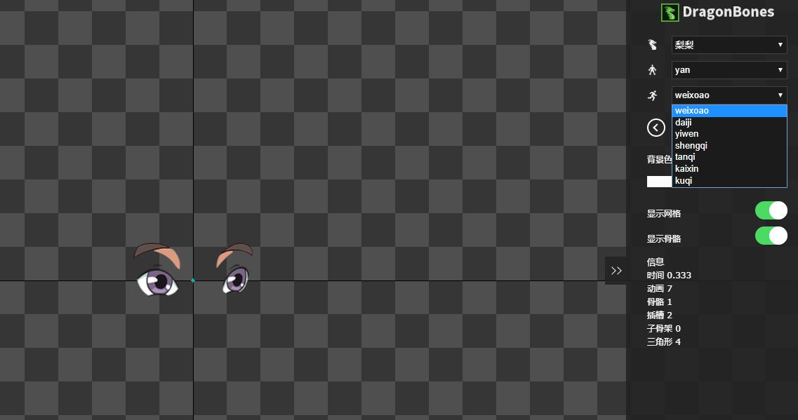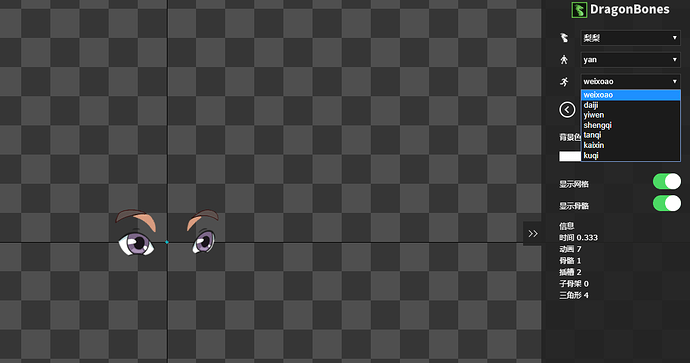 如图,这个龙骨是3套动画,眼睛和鼻子是单独的。可以使用龙骨换装把鼻子和眼睛单独切换,现在不知道 怎么单独播放眼睛和鼻子的动画。