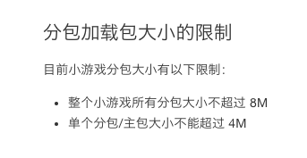 就是单个分包不能超过4M 主包不能超过4M 所有分包加起来不能超过8M 意思是说整个游戏的包体扩大到了12M 大于4M也没事了吗?就下面这个大小