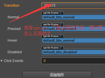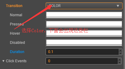 选择button中的transition,更换之后下面的属性面板会随之更新,比如,我选择了Color作为这个按钮的过渡模式,则下面会出现选择过度颜色的属性栏,选择了Sprite作为过渡模式,下面会显示选择sprite的属性栏。