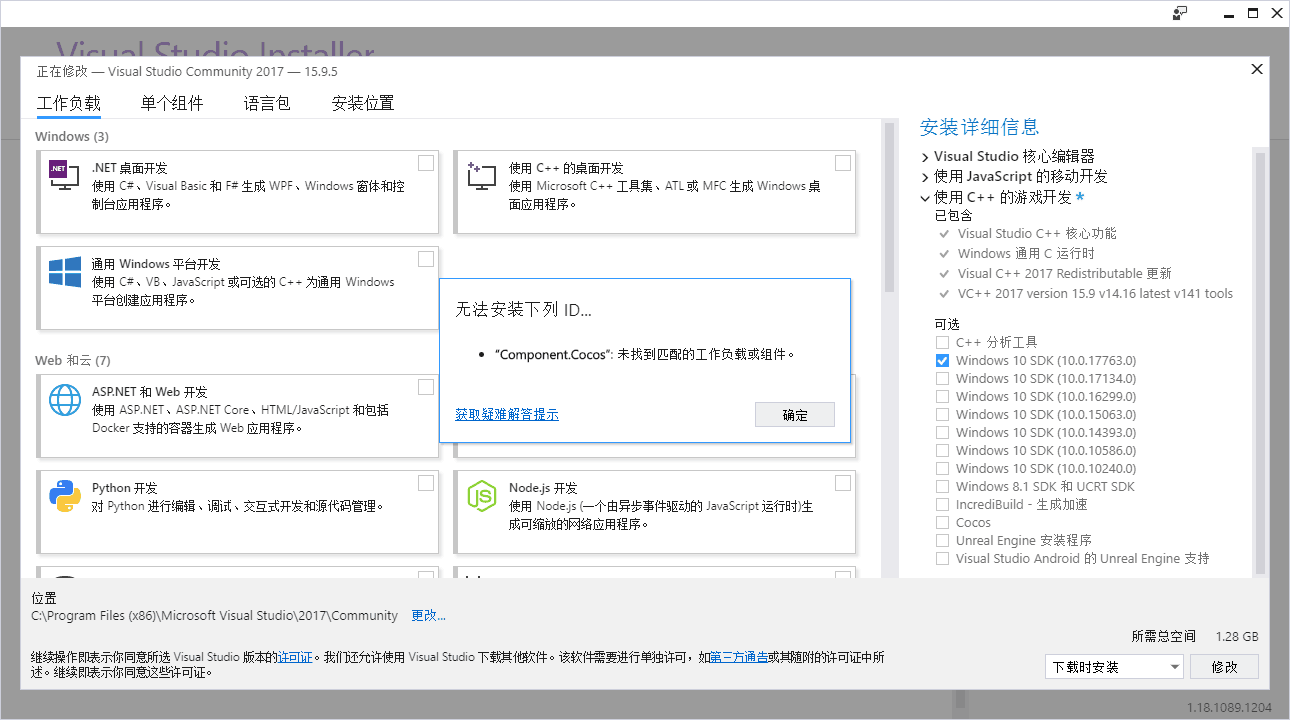 尝试过安装visual studio installer2017下载cocos组件,然后就出现下面这个提示