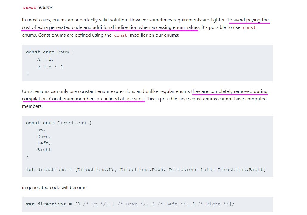 TypeScript 支持 常量枚举 const enum。常量枚举经过tsc编译后直接变成了对应的值,可以减小生成后的代码量,微软官方文档参考:http://www.typescriptlang.org/docs/handbook/enums.html