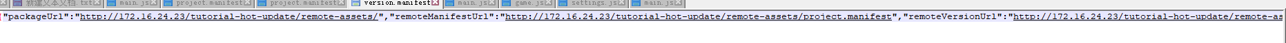 {“packageUrl”:“http://172.16.24.23/tutorial-hot-update/remote-assets/",“remoteManifestUrl”:“http://172.16.24.23/tutorial-hot-update/remote-assets/project.manifest”,“remoteVersionUrl”:“http://172.16.24.23/tutorial-hot-update/remote-assets/version.manifest”,“version”:"1.0.0”}