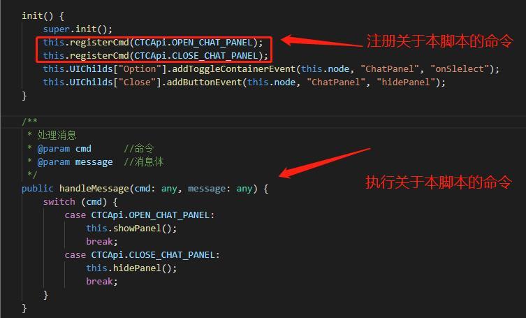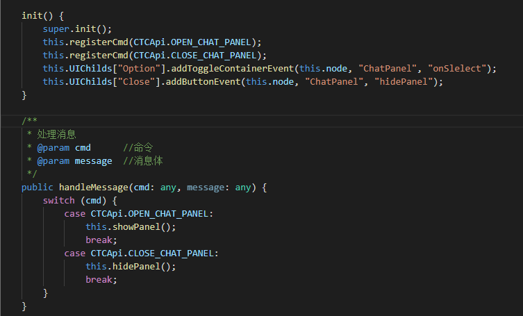 看不懂你在干嘛,也没见你传消息啊,命令的话可以进行抽象,命令对象来发消息,可以写成openChatPabel.doSomething(obj),obj是执行命令的对象,doSomething(){}里面可以写命令的逻辑。