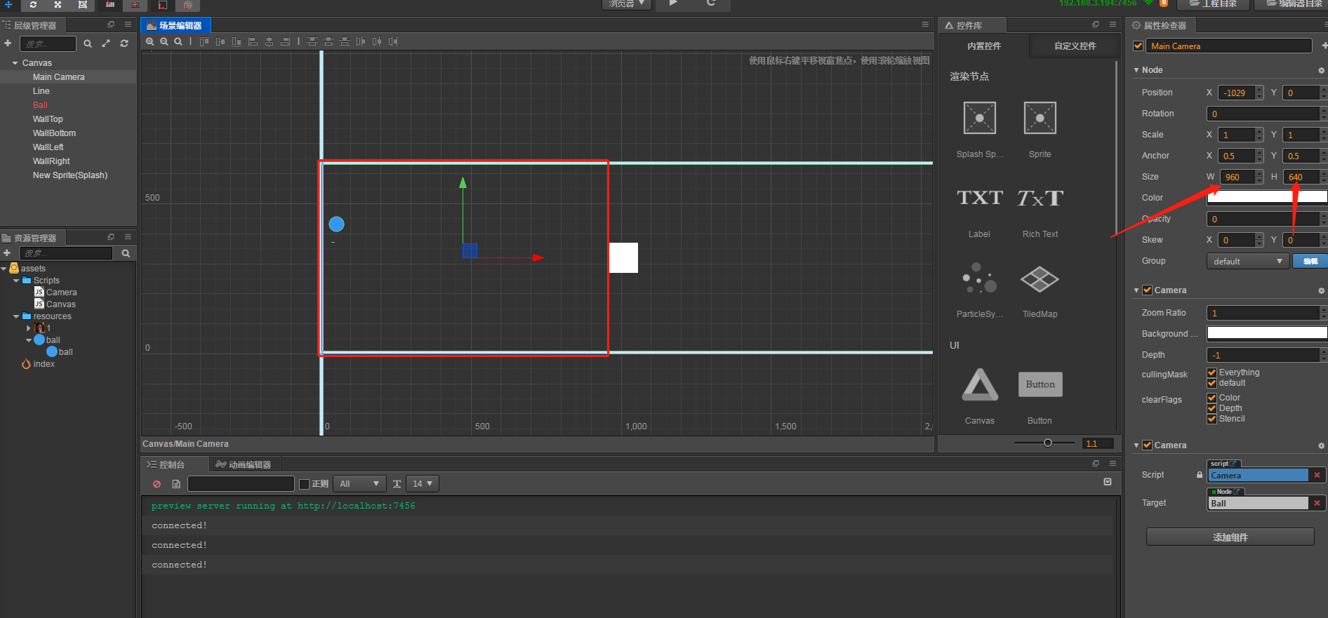 我现在的需求是这样的: 我的场景是横屏的,场景宽度超出屏幕了,我想让摄影机跟随我的小球一点点移动,为啥运行起来跟编辑器中的摄影机视口不一致呢?