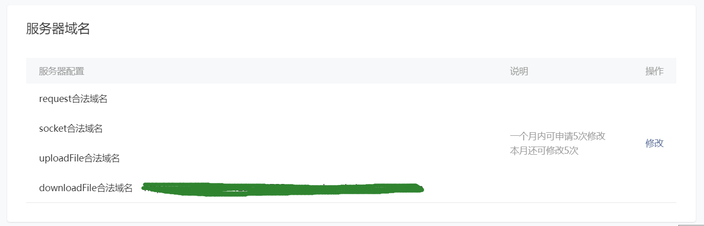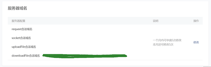 8、进入微信公众平台页面,将downloadFile合法域名改成你刚才复制的腾讯云存储桶的域名